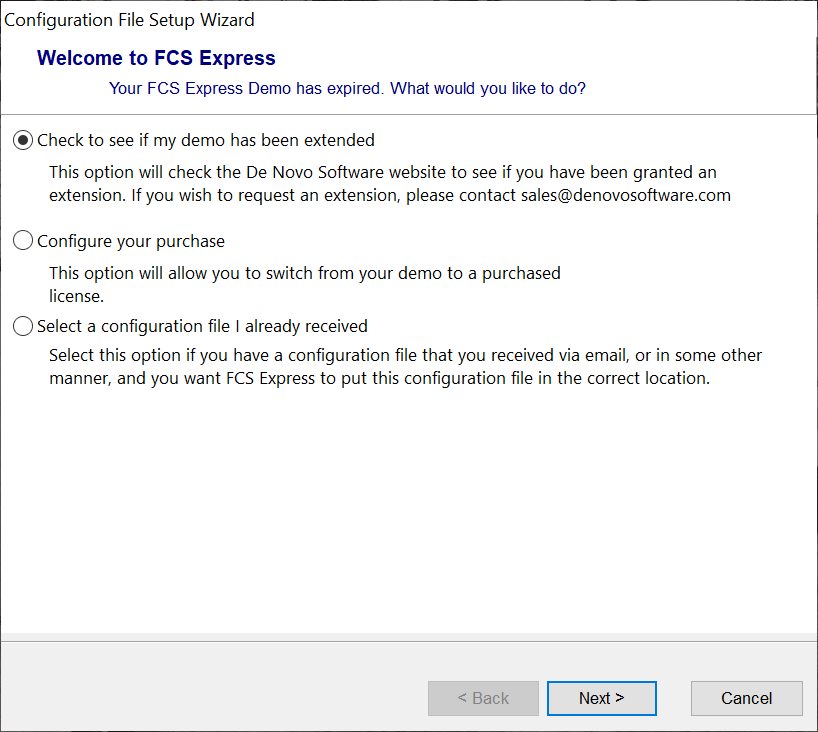 - After confirmation of the extension, click Continue. You can continue logging into De Novo Software account to retrieve an updated copy of the configuration file, or, you can simply quit the wizard to start using FCS Express.