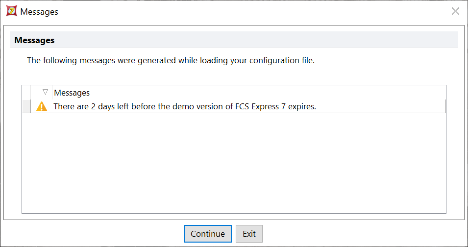 - When FCS Express starts up, it will detect that your configuration file is present. If a configuration file is about to expire, FCS Express will prompt you of this status. Click Continue.