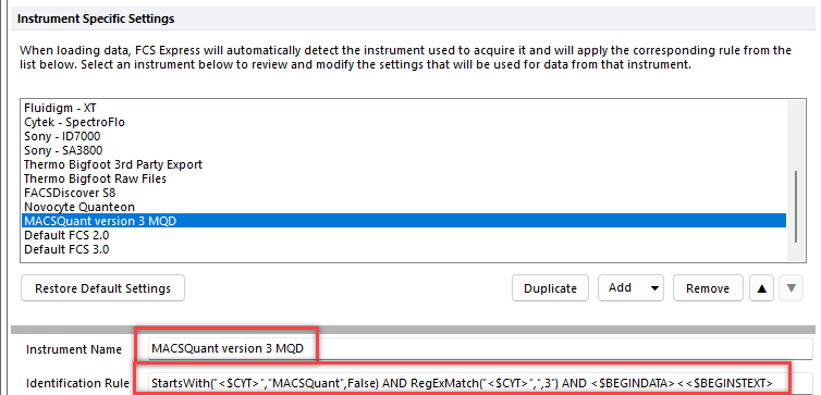 - In Identification Rule, delete the existing text and enter StartsWith("<$CYT>","MACSQuant",False) AND RegExMatch("<$CYT>",",3") AND <$BEGINDATA><<$BEGINSTEXT>