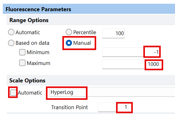 - Under Fluorescence Parameters and under Scale Options, uncheck Automatic