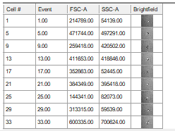 Images may be viewed through the Data Grid object in FCS Express. The data grid will display all cell by cell multiparametric numeric results and for .ACS files, it will include a column at the far right for "Brightfield" that will contain all images collected by the CytPix. Depending on your acquisition settings, there may be images for all events, or just some events. The "ImageFlag" parameter indicates a value of 1 for events with images and a value of 0 for events without images.
