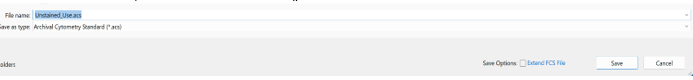 - Before naming the file and clicking Save, check or uncheck the Extend FCS File check box to choose to save data with the extended parameters (examples below).