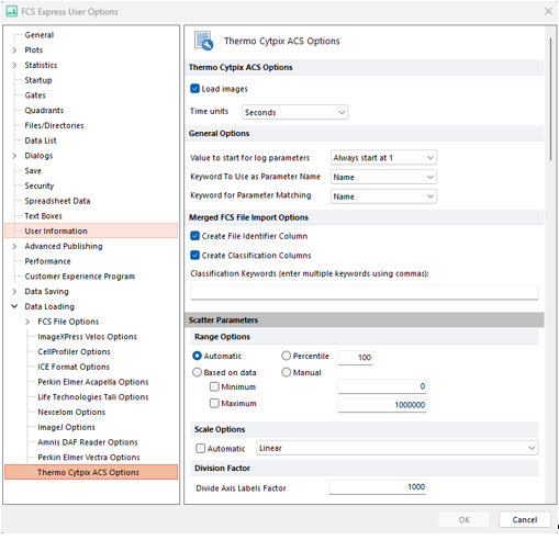 Before loading your data, you can also setup Thermo Cytpix ACS Options via File tab>Options>Data Loading>Thermo Cytpix ACS Options. These options will allow you to set preferences of how you would like to visualize and scale data sets.