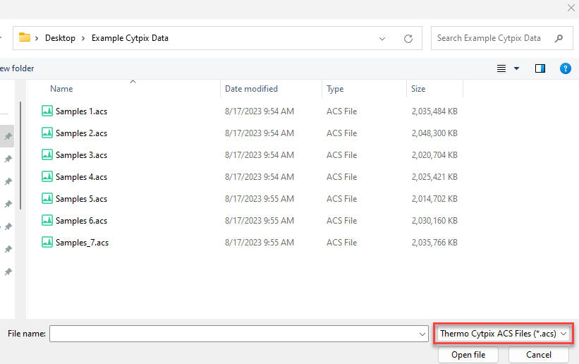 When using the blue plus button (+) to load .ACS files into the data list, ensure Thermo Cytpix ACS Files (*.acs) is selected from the Files of Type drop-down (example below).