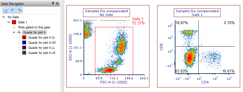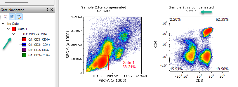 When new quadrants are added to a plot, they are assigned to the hierarchy as children of the Current Gate on the plot. In the example below, the quadrants were created on the right plot. Those quadrants appeared as children of Gate 1.