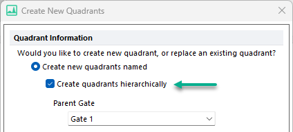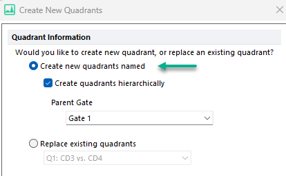 When quadrants are added to a plot, the prompt window (shown in the figure below) will appear. "Create new quadrants named" will be selected by default.