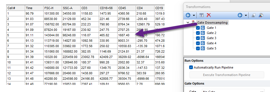 Cell-by-cell gate information can be exported for your data through the FCS Express Pipelines feature.