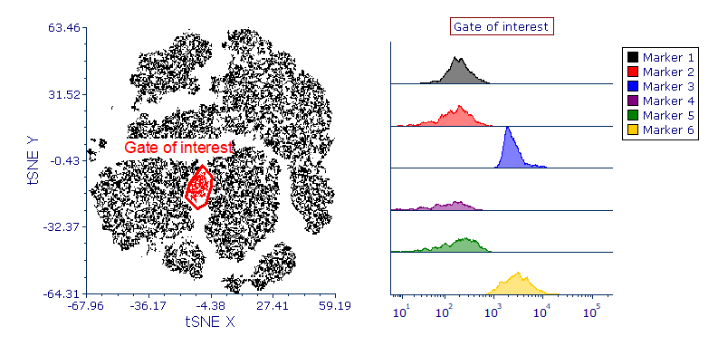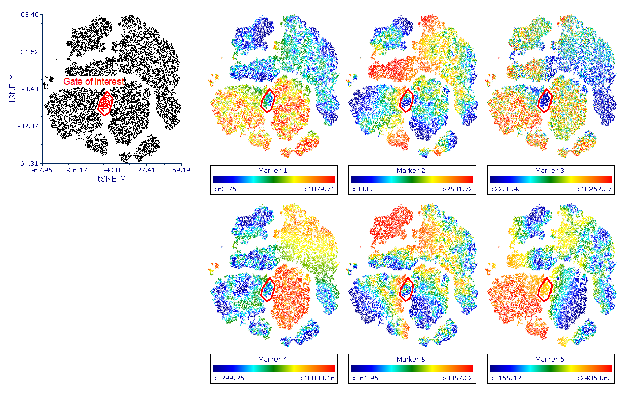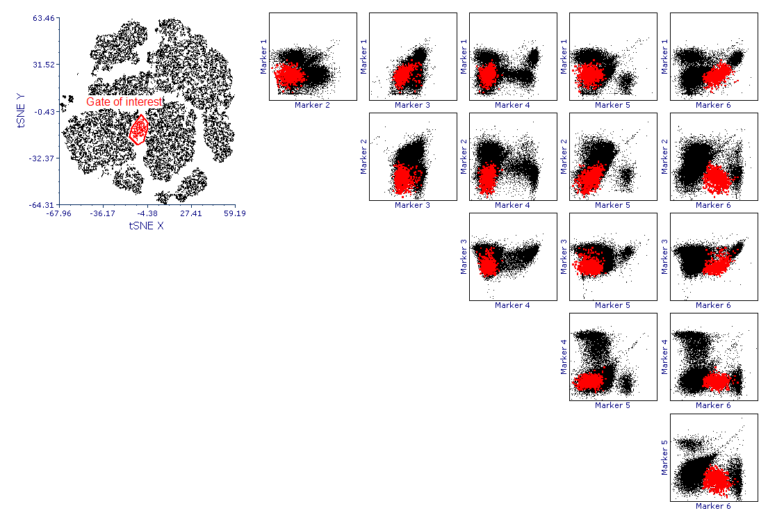 After creating a gate around population of interest on the dimensionality-reduced dataset (e.g. tSNE map, UMAP map, PCA, map,...) the population of interest can be backgated on classical 2D Color Dot Plots.