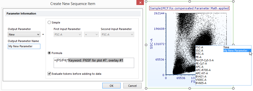 You can now click on the axis of your plot to access the newly created ratio parameter, which will look as it did in BD FACSDiva. FCS Express will use the compensation, if any, applied to the plot, and “Parameter Math applied” will be appended to plot title.