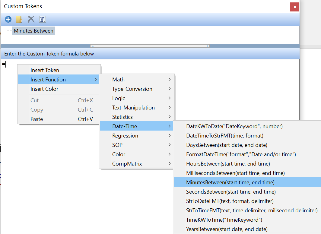 | 7. From the Date-Time category, select the function MinutesBetween(start time, end time).