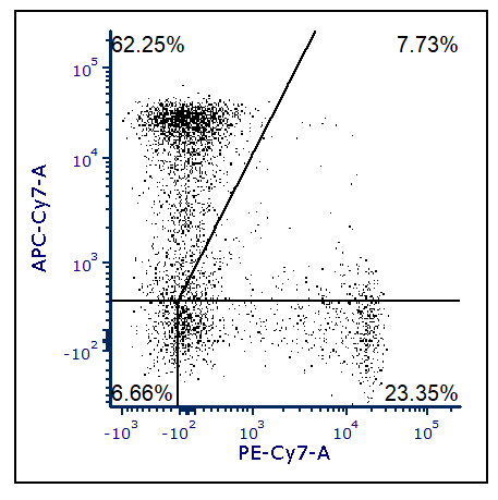For example, in the plot below, the centerpoint of the quadrants is set at the 30th percentile along the X axis and Y axis. When the arms of the quadrants are each parallel to an axis (and form 90 degree angles), the percentage of events in the Upper-Left and Lower-Left quadrants total 30%. Likewise, the percentage of events in the Lower-Left and Lower-Right quadrants total 30%.