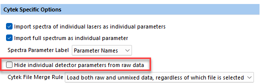 - In the Cytek Specific Options section of Cytek-SpectroFlo options (scroll down in dialog) uncheck the box next to Hide individual detector parameters from raw data (image below).