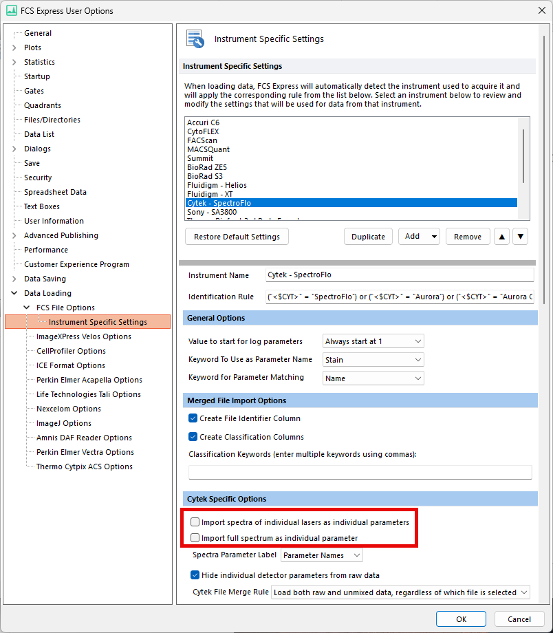 - Under Cytek Specific Options uncheck Import spectra of individual lasers as individual parameters and Import full spectrum as individual parameter