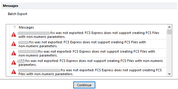 If a spectral data file is exported to FCS file format via the Data tab > Save/Merge from Files window, you may encounter the following error message "XXX.fcs was not exported: FCS Express does not support creating FCS Files with non-numeric parameters."