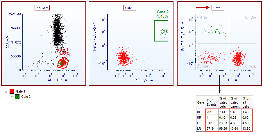 The image below shows a basic analysis of two gates and quadrants. The gate, P1, is the parent of P2, and P2 is the parent of the quadrants, Q1-Q4. As you can see, the statistics are calculated to reflect this hierarchical relationship.