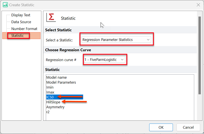Note: EC50 and IC50 are equal, within FCS Express, the statistic is named "IC50", which can be used for both values.- One way to report these statistics is by right-clicking on the Scatter with Regression plot > Statistics > Regression Parameter Statistics