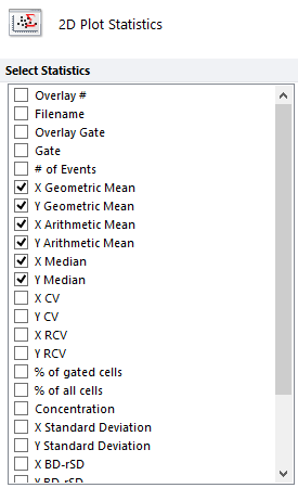For bivariate (2D) plots, you can select X Geometric Mean, Y Geometric Mean, X Arithmetic Mean, Y Arithmetic Mean, X Median, and Y Median, where X and Y represent the X and Y parameters that are being displayed in the 2D plot of interest.