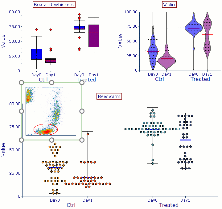 | The new version of FCS Express 7 allows to easily create Summary charts in Violin and Beeswarm style. Both styles may be combined with the already-existing Box and Whisker style.