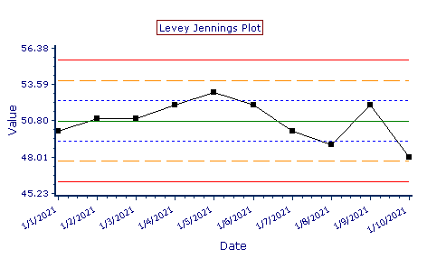 Levey Jennings plots allow you to visualize quality control data to ensure test metrics are stable over time and fall within a predetermined range. |