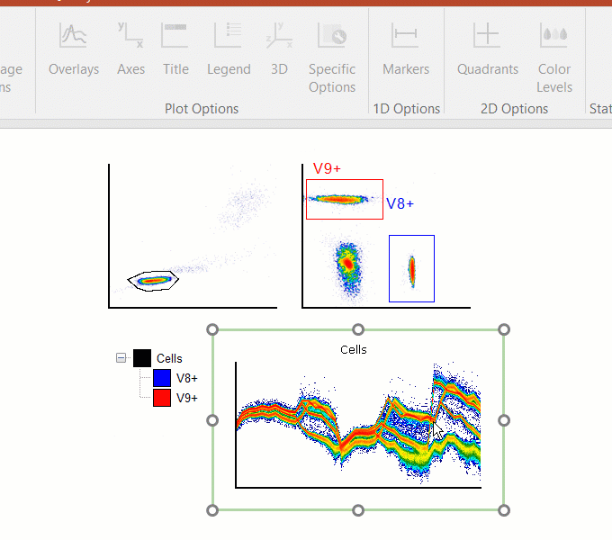 FCS Express provides the capability to read raw spectral data from Cytek and Sony instruments in the 1D plot type, Spectrum Plots, for the analysis of spectral data. FCS Express also supports spectral unmixing from single stained controls. Data can be presented in the spectrum plot with numerous density, line, and backgating options to optimize displays for analysis. The color of each line can reflect the color of the gate in which the event falls effectively providing backgating information for spectral data. Multiple populations or files may also be overlaid with ease.