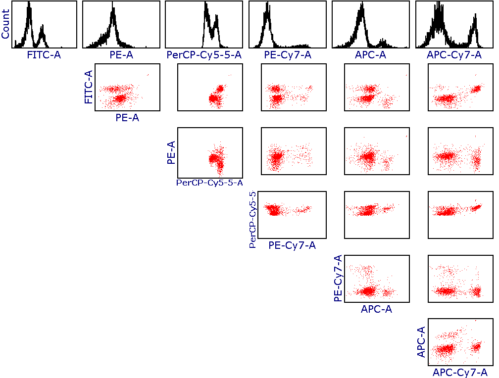 | Multi plots may also be created on all NxN combinations of parameters or conveniently for only compensated parameters. When using the NxN Plots or NxN Plots Compensated feature an additional row of all parameters as histograms will be present as the top column. With any multi plot group all individual plots may be accessed, formatted, and removed from the group just as you would work with groups of images in PowerPoint. The new grouping technology allows you to quickly create graphs to get the big picture of your data set while also allowing you to access just the plots you need for analysis and reporting. | ![]() |