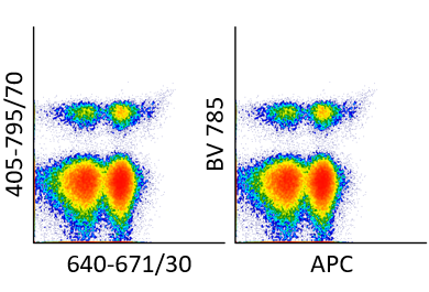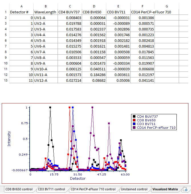 View your single color controls in a spectra viewer on the EasyPanel website. The actual spectral signature automatically gets compared to the expected signature for that fluorophore. A similarity score is calculated.