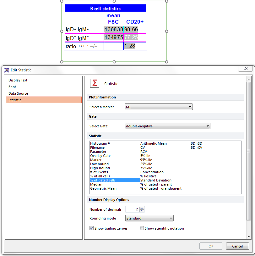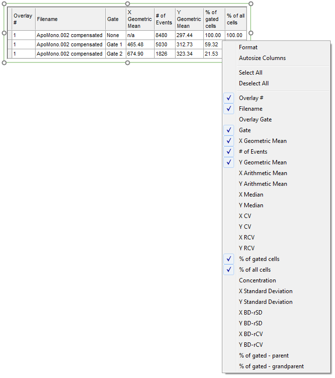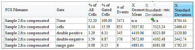 Many different statistics are available, including percentiles, percent parent / grandparent, and robust CVs, as well as all of the basic statistics needed for data analysis. You can also have "percent positive" and sample concentration calculated directly on the statistics screen. All statistics can be dragged and dropped to any location in the layout, dragged and dropped into an integrated spreadsheet, or copied to the clipboard for easy pasting into any Windows® program. Additionally, statistics can be added to your exports in a Batch Process of your entire dataset.