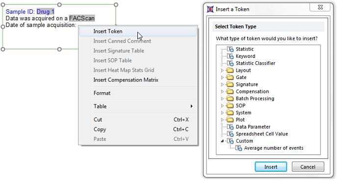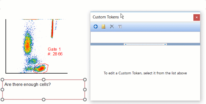 Tokens may be used on your layout in plots, text boxes, spreadsheets and exports. Although they are viewed as text, they are dynamically evaluated and can display information, such as plot statistics, FCS file keywords, layout properties, and system information. For example, tokens can be used to display the percentage of events in a quadrant, the instrument and date of sample acquisition, the number of pages in a layout, and the active computer user profile.