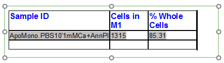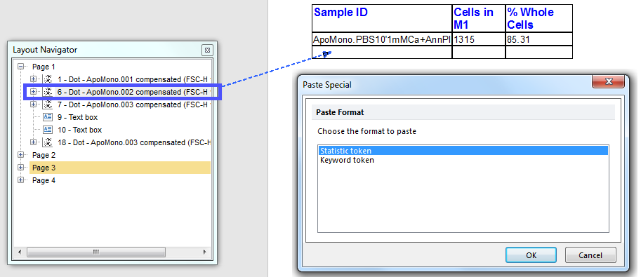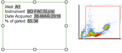Tokens may be inserted anywhere in the layout, such as text boxes, plots, and spreadsheets. In the example below, tokens are the text highlighted in grey, displaying keywords from the sample for the Well ID, name of the cytometer used for data collection, and date of acquisition as well as the statistic for percentage of events in the red gate from the plot on the right: