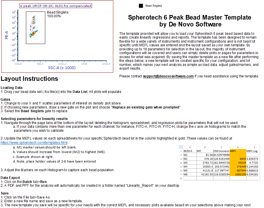 De Novo Software and Spherotech have recently collaborated to provide FCS Express analysis layouts for easy analysis and reporting of Spherotech's 6 and 8 peak calibration particle kits. The FCS Express layouts allow users to easily load data acquired from any cytometer, adjust the layout to the specific configuration of the cytometer, and easily report all linearity results at a click. The layouts can then be saved so they are specific to your own cytometer configuration and used over and over again greatly simplifying analysis by eliminating the need to use multiple software packages or Excel spreadsheets.