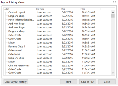 The layout history window will show every action performed in FCS Express as part of the logging and audit trail process. Every action is linked back to the user, date and time of the event. When you are ready to report the audit trail simply print or export to PDF.